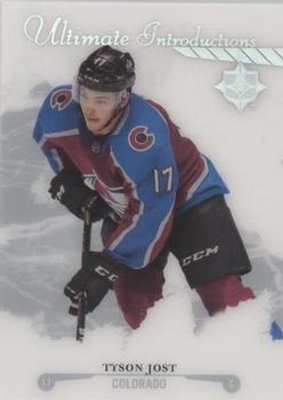The Tyson Jost 2017 Upper Deck Ultimate Collection #UI-29 Ultimate Introductions Rookie card is 1 of 18 Tyson Jost's card variations in the 2017 Upper Deck Ultimate Collection set being tracked by Sports Card Investor, including Base /99, Auto Patch /10, Shield Patch /1, Future Legacy Signatures, and 2007 Retro Rookie Auto /299.