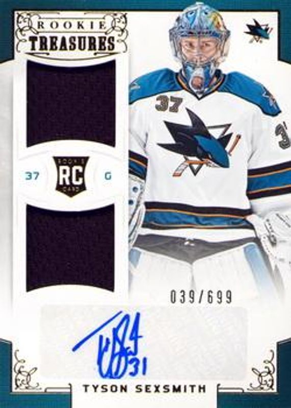 The Tyson Sexsmith 2012 Panini Rookie Anthology #140 Base /699 card is 1 of 29 Tyson Sexsmith's card variations in the 2012 Panini Rookie Anthology set being tracked by Sports Card Investor, including Printing Plates Black /1, Printing Plates Cyan /1, Printing Plates Magenta /1, Printing Plates Yellow /1, and Autographs.