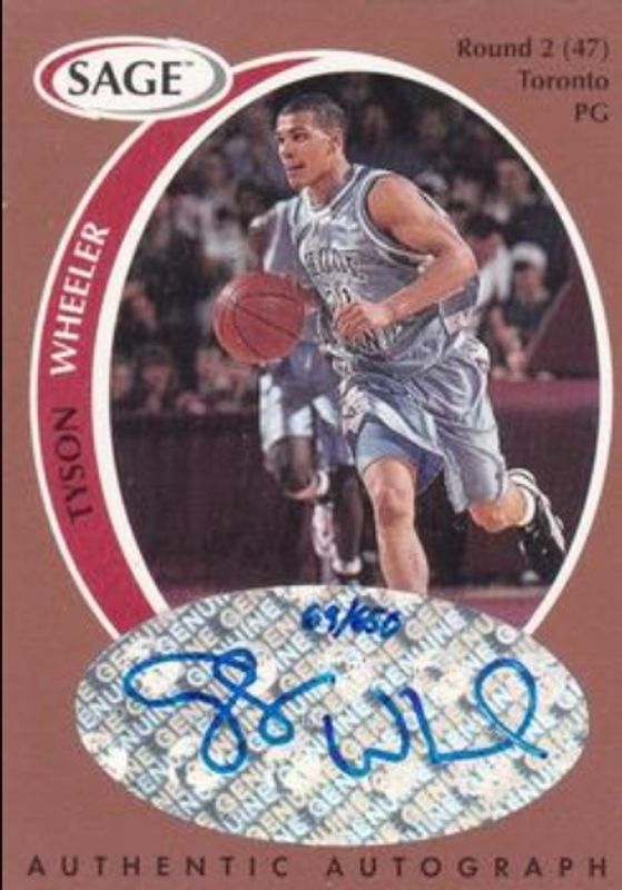 The Tyson Wheeler 1998 Sage #A46 Autographs Bronze /350 Rookie card is 1 of 8 Tyson Wheeler's card variations in the 1998 Sage set being tracked by Sports Card Investor, including Base, Autographs Player Proof, Autographs /535, Autographs Silver /215, and Autographs Gold /110.