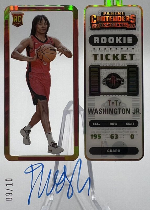 The TyTy Washington Jr. 2022 Contenders #128 Rookie Ticket Auto - Clear Ticket /10 card in Raw condition has not changed in price in the last 30 days and was last sold for $11.50 .