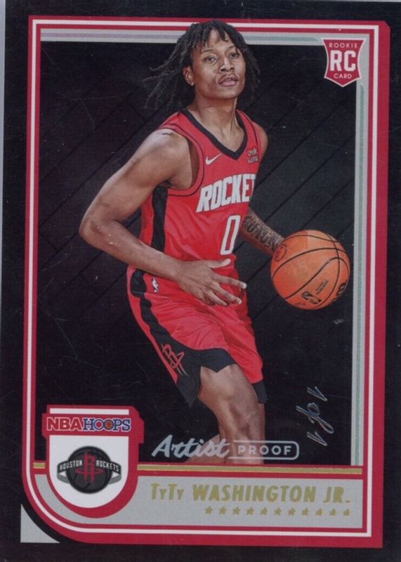 The TyTy Washington Jr. 2022 Hoops #258 Artist Proof Black /1 Rookie card in Raw condition has not changed in price in the last 30 days and was last sold for $46.00 .
