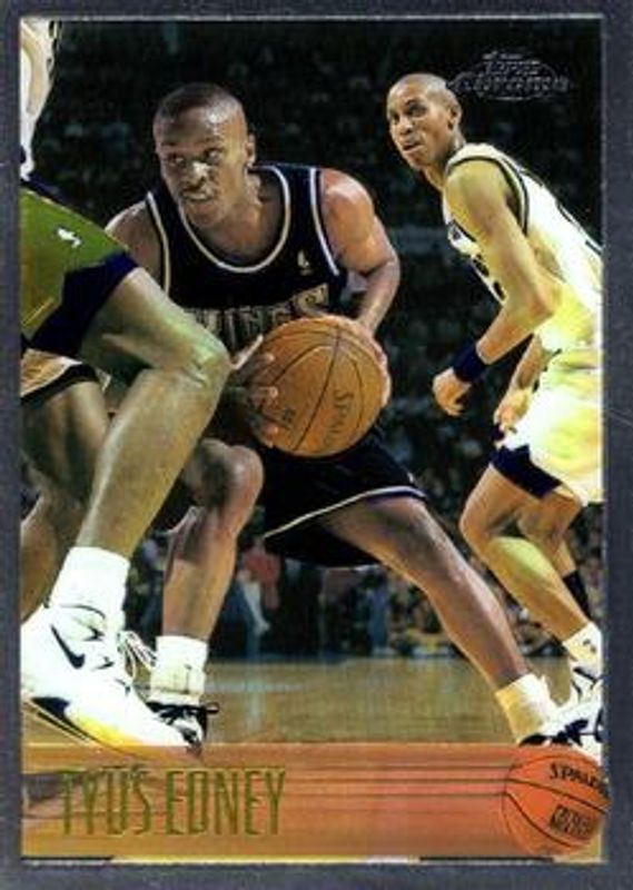 The Tyus Edney 1996 Topps Chrome #134 Base card is 1 of 2 Tyus Edney's card variations in the 1996 Topps Chrome set being tracked by Sports Card Investor, including Refractor.