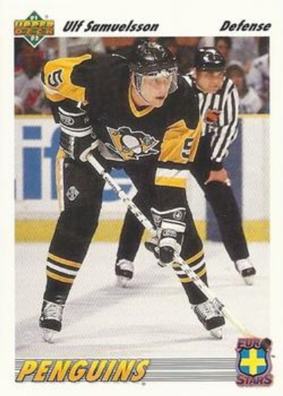 The Ulf Samuelsson 1991 Upper Deck #E17b Euro Stars card is 1 of 4 Ulf Samuelsson's card variations in the 1991 Upper Deck set being tracked by Sports Card Investor, including #230 Base, #E17 Euro Stars, and #E17a Euro Stars.