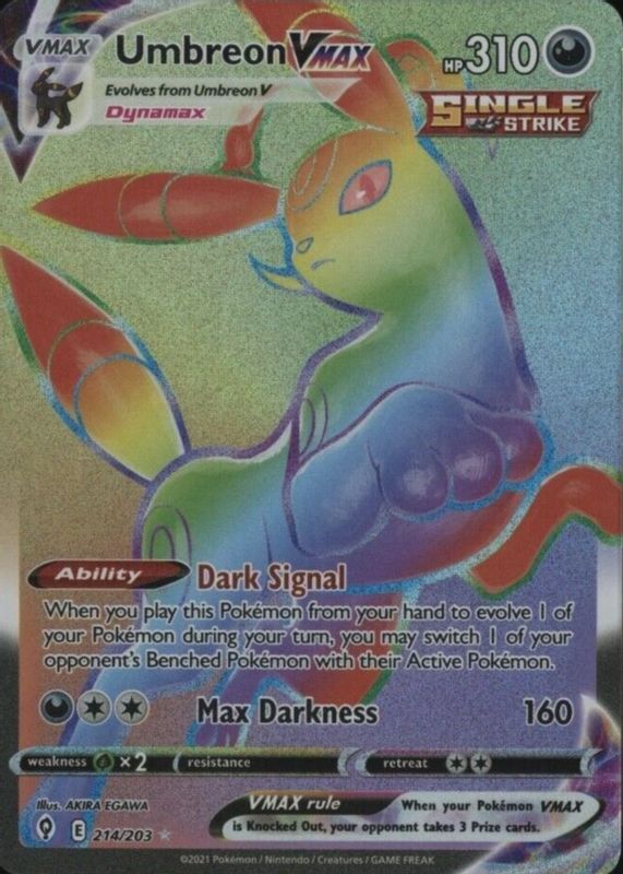 The Umbreon VMAX 2021 Sword & Shield: Evolving Skies #214/203 Holo (Secret) card in Raw TCG (Near Mint) condition has moved down -$3.85 (-7.9%) in the last 30 days and was last sold for $44.99 .