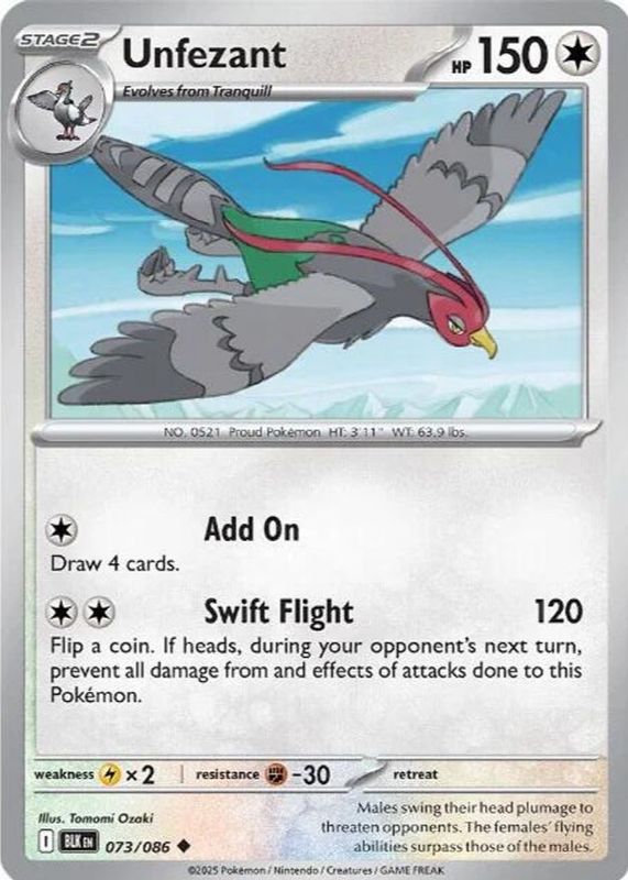 The Unfezant 2025 Scarlet & Violet: Black Bolt #073/086 Base card in Raw TCG (Near Mint) condition has not changed in price in the last 30 days and was last sold for $1.00 .