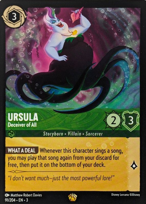 The Ursula - Deceiver of All 2024 Into the Inklands #91/204 Base card in Raw TCG (Near Mint) condition has moved up $0.29 (+11.6%) in the last 30 days and was last sold for $2.79 .