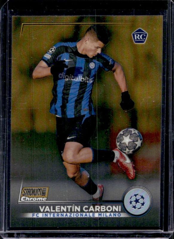 The Valentin Carboni 2022 Topps Stadium Club Chrome UEFA Club Competitions #45 Gold Refractor /50 Rookie card is 1 of 40 Valentin Carboni's card variations in the 2022 Topps Stadium Club Chrome UEFA Club Competitions set being tracked by Sports Card Investor, including #45 Base, #45b Base, #45c Base, #45 Blue Prism Refractor, and #45 Pink Red Electric Charge Refractor.