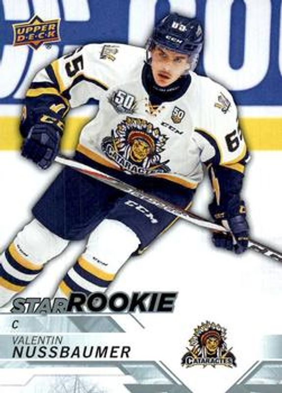 The Valentin Nussbaumer 2018 Upper Deck CHL #326 Base card is 1 of 10 Valentin Nussbaumer's card variations in the 2018 Upper Deck CHL set being tracked by Sports Card Investor, including Silver, Star Rookies UD Exclusives /100, Star Rookies Midnight /25, Star Rookies High Gloss /10, and Printing Plates Black /1.