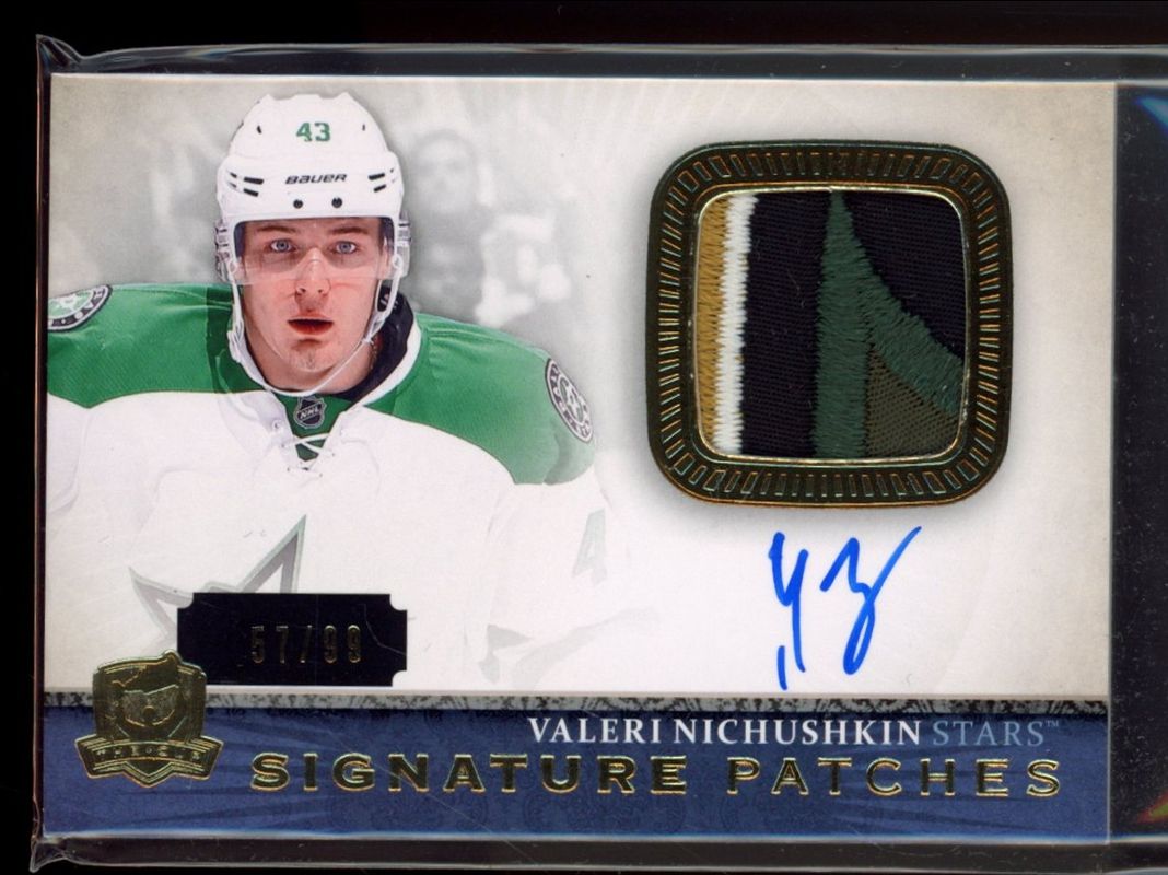 The Valeri Nichushkin 2013 Upper Deck The Cup #SP-VN Signatures Patches /99 Rookie card is 1 of 44 Valeri Nichushkin's card variations in the 2013 Upper Deck The Cup set being tracked by Sports Card Investor, including Base /249, Gold Rookie Autographed Patch /58, Gold Rainbow /25, Gold /14, and Black Laundry Tags /3.
