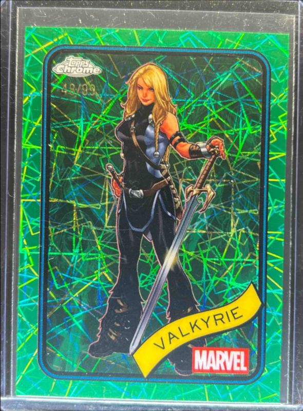 The Valkyrie 2025 Topps Chrome #187 Hulk Green Lazer Refractor /99 card is 1 of 23 Valkyrie's card variations in the 2025 Topps Chrome set being tracked by Sports Card Investor, including Base, Refractor, Yellow Lava Refractor, Spider Web Refractor /399, and Blue Refractor /299.
