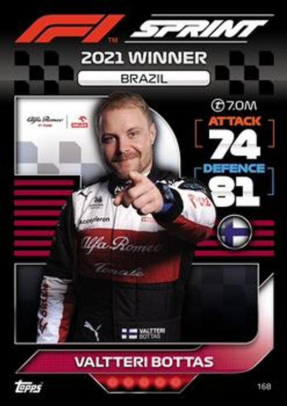 The Valtteri Bottas 2022 Topps Turbo Attax Formula 1 #168 Base card is 1 of 27 Valtteri Bottas' card variations in the 2022 Topps Turbo Attax Formula 1 set being tracked by Sports Card Investor, including #87 Base, #86 Base, #85 Base, #351 Base, and #315 Base.