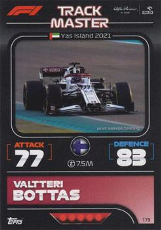 The Valtteri Bottas 2022 Topps Turbo Attax Formula 1 #179 Base card is 1 of 27 Valtteri Bottas' card variations in the 2022 Topps Turbo Attax Formula 1 set being tracked by Sports Card Investor, including #168 Base, #87 Base, #86 Base, #85 Base, and #351 Base.