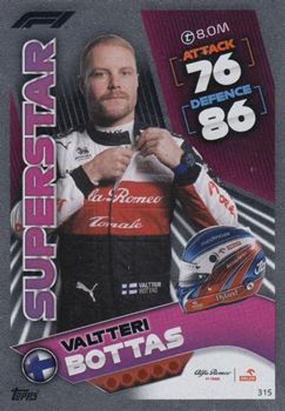 The Valtteri Bottas 2022 Topps Turbo Attax Formula 1 #315 Base card is 1 of 27 Valtteri Bottas' card variations in the 2022 Topps Turbo Attax Formula 1 set being tracked by Sports Card Investor, including #168 Base, #87 Base, #86 Base, #85 Base, and #351 Base.