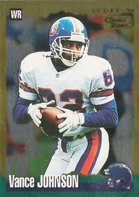 The Vance Johnson 1994 Score #195 Gold Zone card is 1 of 2 Vance Johnson's card variations in the 1994 Score set being tracked by Sports Card Investor, including Base.