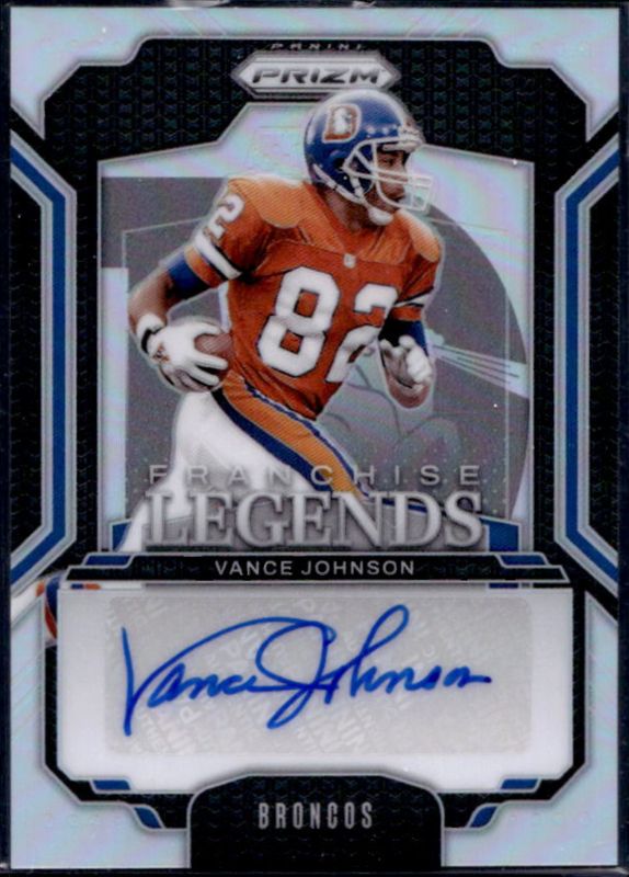 The Vance Johnson 2024 Prizm #FL-VJN Franchise Legends /149 card is 1 of 21 Vance Johnson's card variations in the 2024 Prizm set being tracked by Sports Card Investor, including Flashback Autographs /149, Sensational Signatures /149, Flashback Autographs - Blue Ice /99, Franchise Legends - Blue Ice /99, and Sensational Signatures - Blue Ice /99.