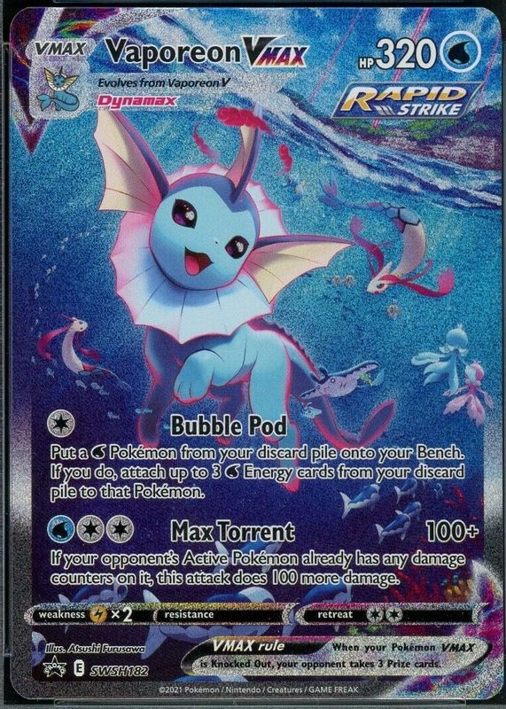 The Vaporeon VMAX 2021 Sword & Shield: Black Star Promo #SWSH182 Premium Collection (Vaporeon VMAX) (Full Art) card in Raw TCG (Near Mint) condition has moved down -$1.74 (-2.0%) in the last 30 days and was last sold for $84.99 .