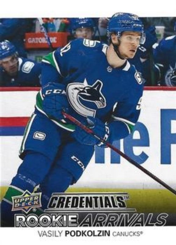 The Vasily Podkolzin 2021 Upper Deck Credentials #RA-10 Rookie Arrivals card is 1 of 28 Vasily Podkolzin's card variations in the 2021 Upper Deck Credentials set being tracked by Sports Card Investor, including Base /999, Yellow /249, Red /199, Orange /149, and Blue /99.