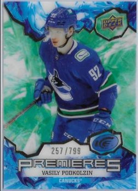The Vasily Podkolzin 2021 Upper Deck Ice #241 Green /799 Rookie card is 1 of 44 Vasily Podkolzin's card variations in the 2021 Upper Deck Ice set being tracked by Sports Card Investor, including #145 Base /999, #241 Base /999, #145 Ice Blue, #145 Jersey, and #145 Lavender.