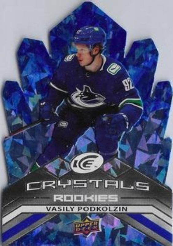 The Vasily Podkolzin 2021 Upper Deck Ice #IC-61 Ice Crystals Rookie card is 1 of 44 Vasily Podkolzin's card variations in the 2021 Upper Deck Ice set being tracked by Sports Card Investor, including #145 Base /999, #241 Base /999, #145 Ice Blue, #145 Jersey, and #145 Lavender.