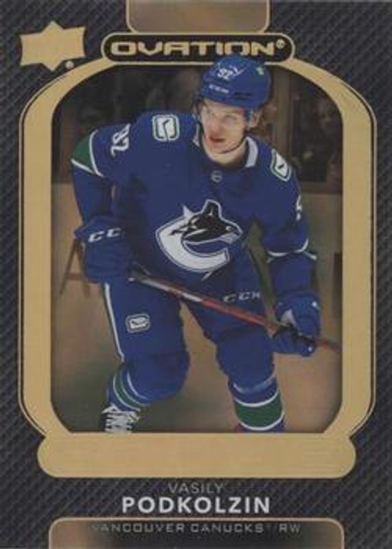 The Vasily Podkolzin 2021 Upper Deck Ovation #145 Gold Circular Wonder Rookie card is 1 of 38 Vasily Podkolzin's card variations in the 2021 Upper Deck Ovation set being tracked by Sports Card Investor, including Base, Checkerboard, Gold Foil, Silver Foil, and Standing Ovation /500.