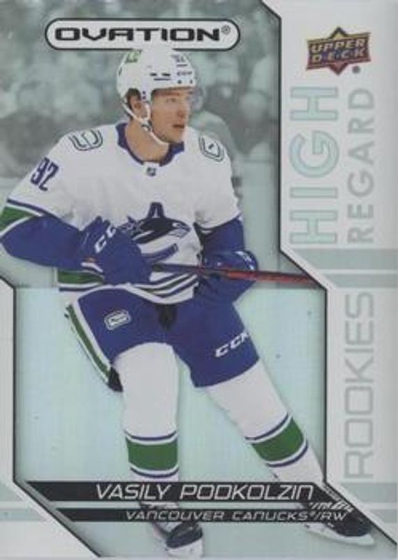The Vasily Podkolzin 2021 Upper Deck Ovation #HRR-14 High Regard Rookies card is 1 of 38 Vasily Podkolzin's card variations in the 2021 Upper Deck Ovation set being tracked by Sports Card Investor, including Base, Checkerboard, Gold Circular Wonder, Gold Foil, and Silver Foil.
