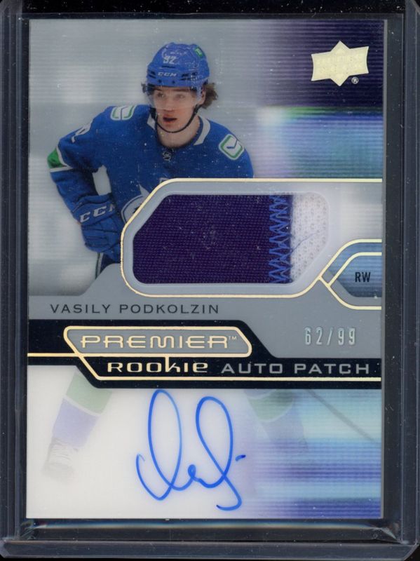 The Vasily Podkolzin 2021 Upper Deck Premier #AR-VP Acetate Rookie - Auto Patch /249 card is 1 of 33 Vasily Podkolzin's card variations in the 2021 Upper Deck Premier set being tracked by Sports Card Investor, including Base /399, Gold /199, Bronze /65, Purple /10, and Platinum /1.