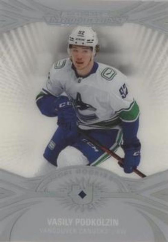 The Vasily Podkolzin 2021 Upper Deck Ultimate Collection #UI-16 Ultimate Introductions Rookie card is 1 of 19 Vasily Podkolzin's card variations in the 2021 Upper Deck Ultimate Collection set being tracked by Sports Card Investor, including Base /299, Ultimate Introductions - Auto, Ultimate Rookies - Jersey /699, Debut Threads /99, and Rookie Accents /99.