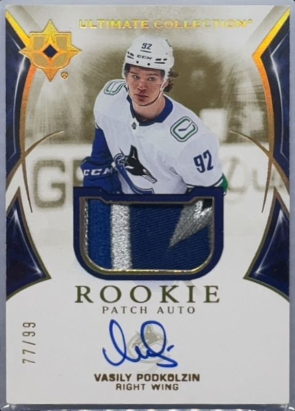 The Vasily Podkolzin 2021 Upper Deck Ultimate Collection #105 Ultimate Rookies - Auto Patch /99 card is 1 of 19 Vasily Podkolzin's card variations in the 2021 Upper Deck Ultimate Collection set being tracked by Sports Card Investor, including Base /299, Ultimate Introductions, Ultimate Introductions - Auto, Ultimate Rookies - Jersey /699, and Debut Threads /99.