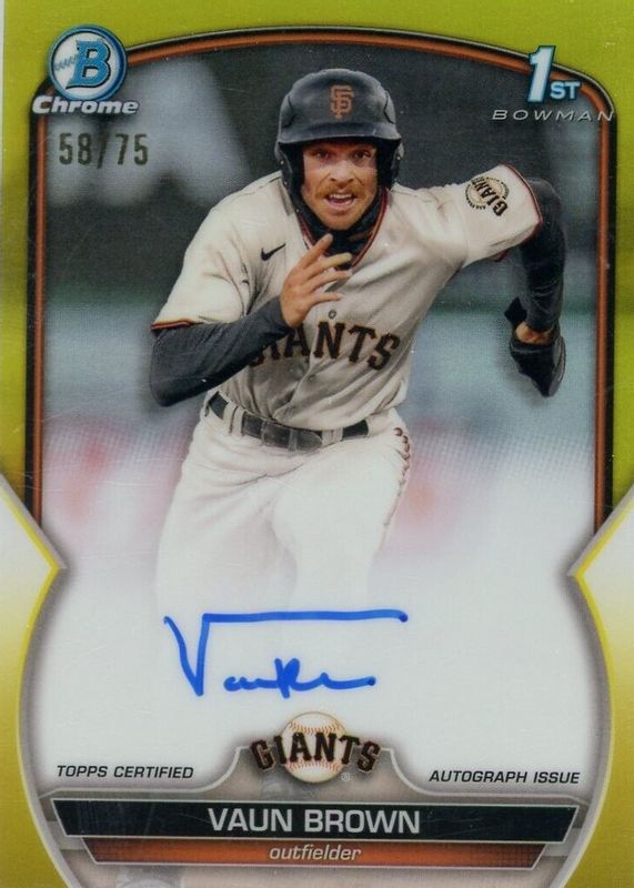 2023 Bowman Chrome Vaun Brown Auto Yellow Refractor 6/75 1st Card Giants