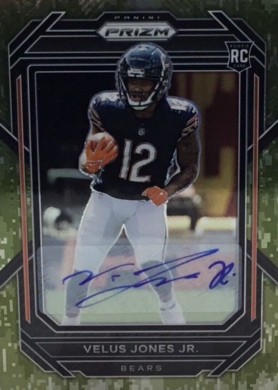The Velus Jones Jr. 2022 Prizm #332 Rookie Autographs - Camo /25 card in Raw condition has not changed in price in the last 30 days and was last sold for $30.00 .
