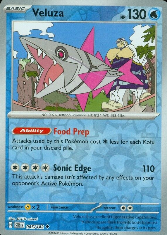 The Veluza 2024 Scarlet & Violet: Stellar Crown #045/142 Reverse Holo card in Raw TCG (Near Mint) condition has not changed in price in the last 30 days and was last sold for $1.25 .