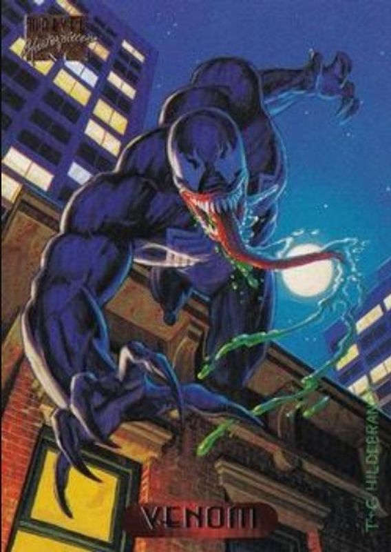 The Venom 1994 Fleer Marvel Masterpieces Hildebrandt Brothers #131 Base card is 1 of 6 Venom's card variations in the 1994 Fleer Marvel Masterpieces Hildebrandt Brothers set being tracked by Sports Card Investor, including Gold Foil Signatures, Bronze Holofoils, Gold Holofoils, Masterprints, and Silver Holofoils.