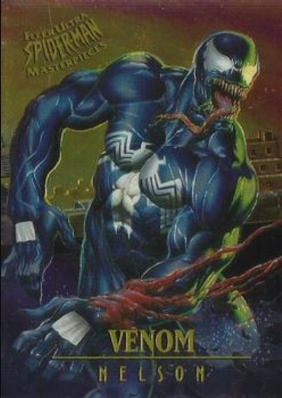 The Venom 1995 Fleer Ultra Spider-Man #7 Masterpieces card is 1 of 20 Venom's card variations in the 1995 Fleer Ultra Spider-Man set being tracked by Sports Card Investor, including #108 Base, #134 Base, #60 Base, #83 Base, and #100 Base.