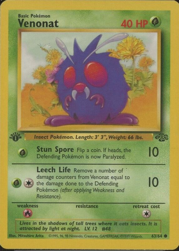 The Venonat 1999 Jungle #63/64 1st Edition card in Raw TCG (Near Mint) condition has moved up $1.26 (+37.3%) in the last 30 days and was last sold for $4.62 .