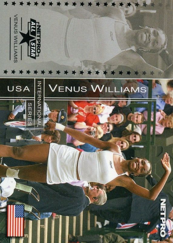 Venus Williams' Tennis cards are available in at least 2 sets. Venus Williams' biggest 7-day price movers are 2003 NetPro #88 International Series All-Star, 2003 NetPro Elite #E6 Event Edition, and 2003 NetPro #4 International Series.
