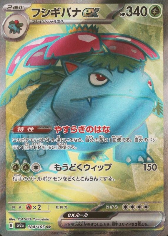 The Venusaur ex 2023 Japanese Scarlet & Violet: 151 #184/165 Super Rare card in Raw TCG (Near Mint) condition has moved down -$3.55 (-36.7%) in the last 30 days and was last sold for $6.14 .