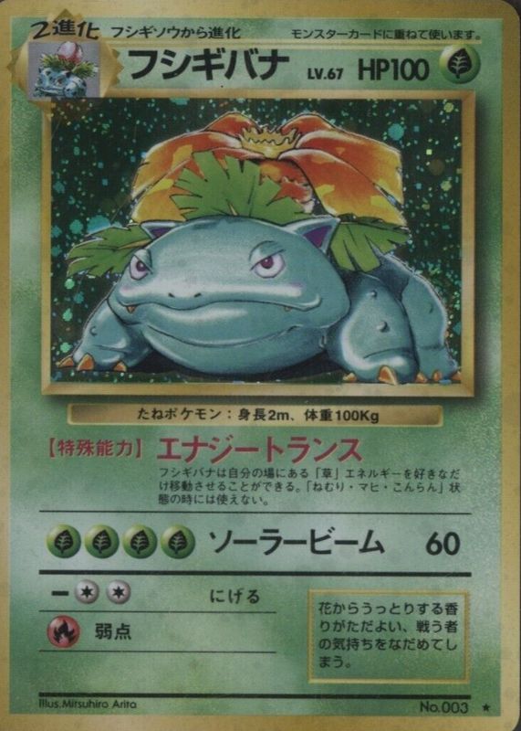 The Venusaur 1996 Japanese Base Set #3 Holo card in Raw TCG (Near Mint) condition has not changed in price in the last 30 days and was last sold for $35.29 .
