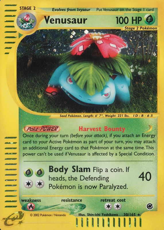 The Venusaur 2002 Expedition #030/165 Holo card in Raw TCG (Heavily Played) condition has not changed in price in the last 30 days and was last sold for $20.00 .