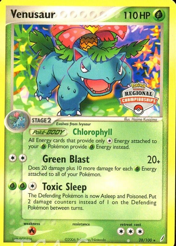 The Venusaur 2006 EX: Crystal Guardians #028/100 Base (Regional Championships) card in Raw TCG (Near Mint) condition has not changed in price in the last 30 days and was last sold for $21.76 .
