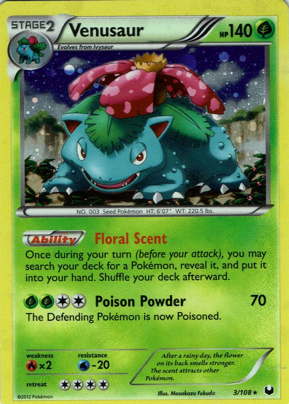 The Venusaur 2012 Black & White: Dark Explorers #003/108 Holo card in Raw TCG (Near Mint) condition has moved up $0.03 (+0.3%) in the last 30 days and was last sold for $9.48 .