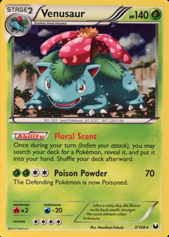 The Venusaur 2012 Black & White: Dark Explorers #003/108 Promo (Cosmos Holo) card in Raw TCG (Near Mint) condition has not changed in price in the last 30 days and was last sold for $4.99 .