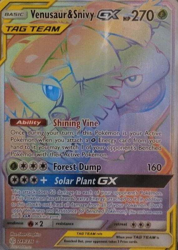 The Venusaur & Snivy GX 2019 Sun & Moon: Cosmic Eclipse #249/236 Holo (Secret) card in Raw TCG (Near Mint) condition has moved up $4.62 (+9.2%) in the last 30 days and was last sold for $54.87 .