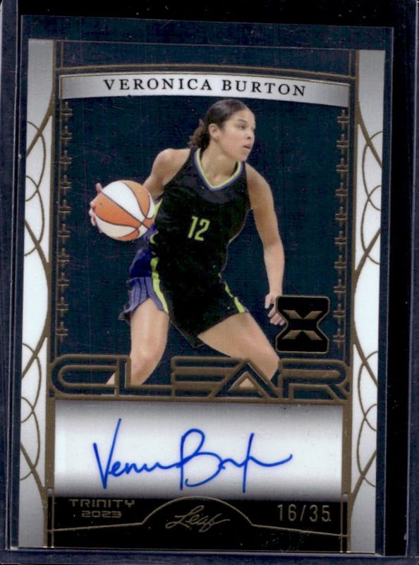 The Veronica Burton 2022 Leaf Trinity #CA-VB1 Clear Auto - Gold /35 Rookie card is 1 of 34 Veronica Burton's card variations in the 2022 Leaf Trinity set being tracked by Sports Card Investor, including Base /49, Gold /35, Blue /30, Holo Platinum /25, and Holo Green /20.