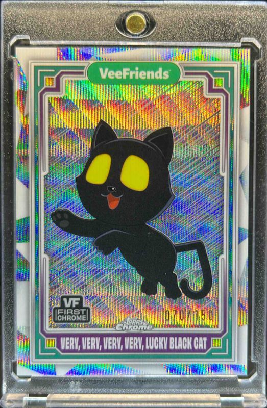 The Very, Very, Very, Very Lucky Black Cat 2025 Topps Chrome VeeFriends #3 Wave Refractor /150 card is 1 of 30 Very, Very, Very, Very Lucky Black Cat's card variations in the 2025 Topps Chrome VeeFriends set being tracked by Sports Card Investor, including Base, Refractor, Yellow Refractor, Shimmer Refractor /250, and RayWave Refractor /199.