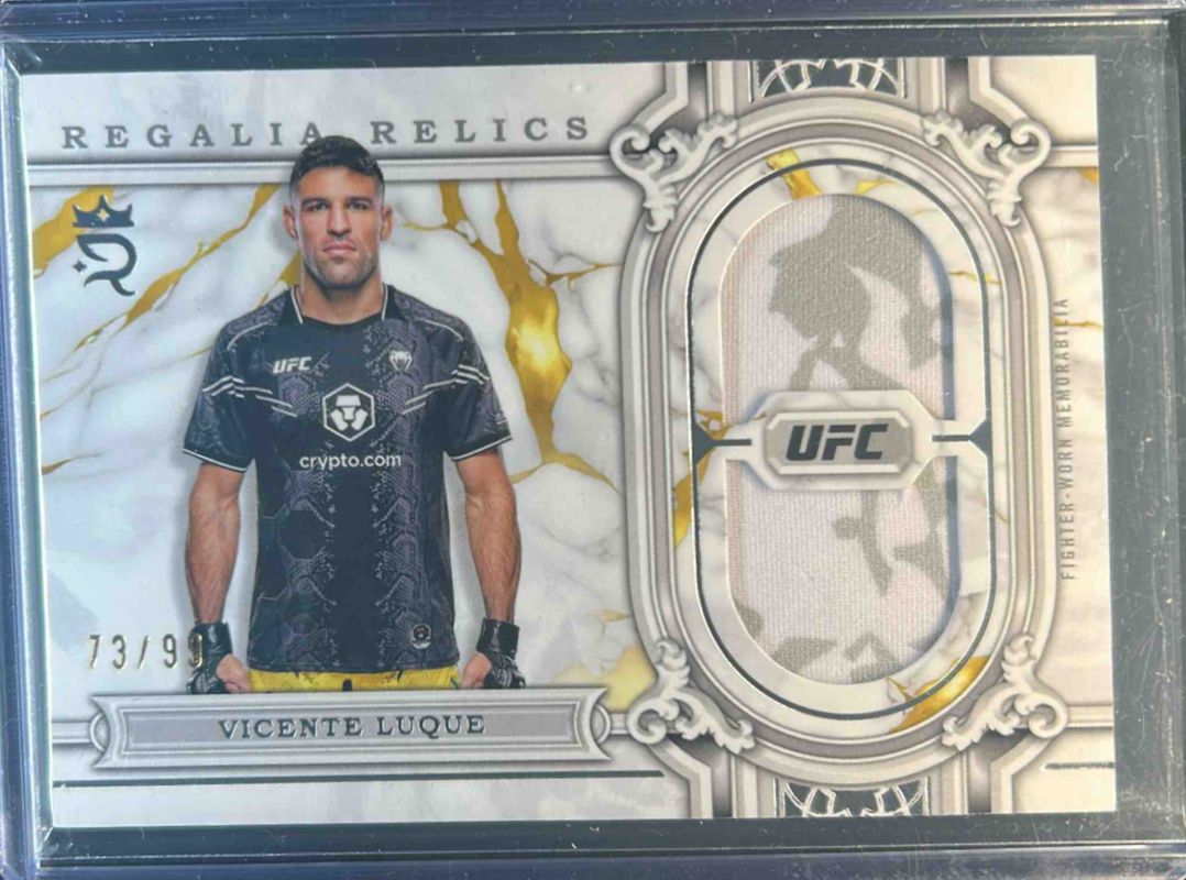 The Vicente Luque 2024 Topps UFC Royalty #RAR-9 Regalia Relics /99 card is 1 of 13 Vicente Luque's card variations in the 2024 Topps UFC Royalty set being tracked by Sports Card Investor, including Regalia Relic Signatures /99, Autographed Jumbo Relic Booklet /25, Regalia Relics - Blue /25, Regalia Relic Signatures - Blue /25, and Regalia Relics - Gold /10.