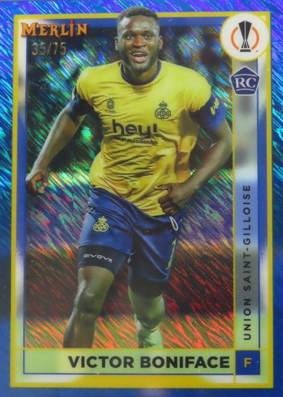 Recent Sales of Victor Boniface 2022 Topps Merlin Chrome UEFA Club Competitions #142 Blue Shimmer Refractor /75 Rookie Raw
