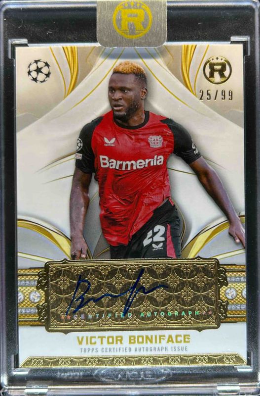 The Victor Boniface 2024 Topps Reverence UEFA Club Competitions #RA-VB Reverence Autographs /99 card is 1 of 7 Victor Boniface's card variations in the 2024 Topps Reverence UEFA Club Competitions set being tracked by Sports Card Investor, including Reverence Autographs - Blue /75, Reverence Autographs - Purple /50, Reverence Autographs - Orange /25, Reverence Autographs - Black /10, and Reverence Autographs - Red /5.