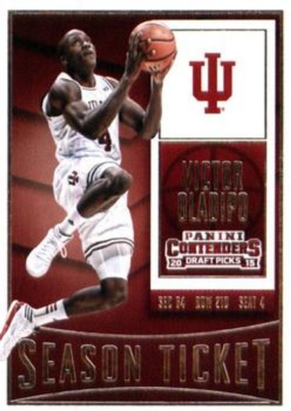 The Victor Oladipo 2015 Contenders Draft Picks #96 Base card is 1 of 12 Victor Oladipo's card variations in the 2015 Contenders Draft Picks set being tracked by Sports Card Investor, including Draft Ticket /99, Season Ticket Cracked Ice /23, Championship Ticket /1, Season Ticket Printing Plates Black /1, and Season Ticket Printing Plates Cyan /1.
