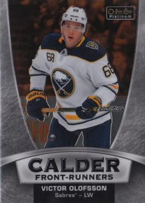 The Victor Olofsson 2019 O-Pee-Chee Platinum #CF-3 Calder Front Runners Rookie card is 1 of 29 Victor Olofsson's card variations in the 2019 O-Pee-Chee Platinum set being tracked by Sports Card Investor, including Base, Matte Pink, Rainbow, Sunset, and Violet Pixels /399.