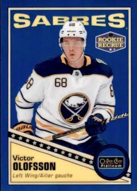 The Victor Olofsson 2019 O-Pee-Chee Platinum #R-61 Retro Blue - Rainbow /149 Rookie card is 1 of 29 Victor Olofsson's card variations in the 2019 O-Pee-Chee Platinum set being tracked by Sports Card Investor, including Base, Matte Pink, Rainbow, Sunset, and Violet Pixels /399.